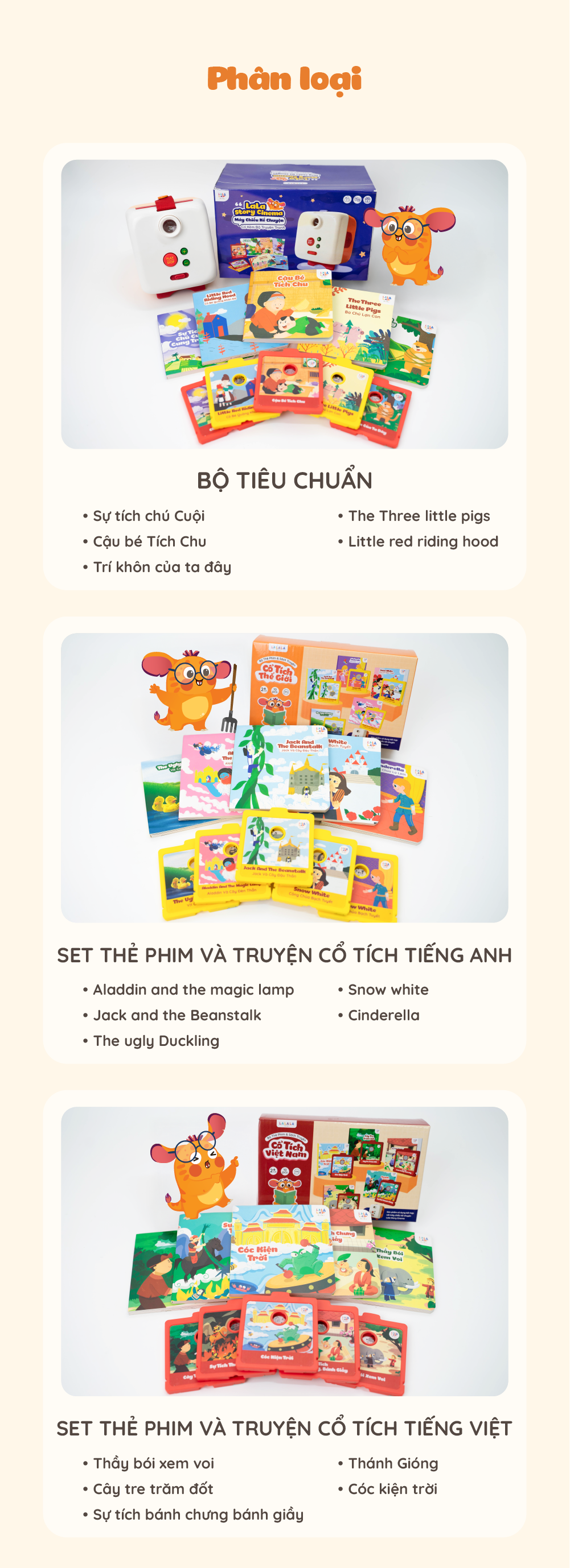 | Phân loại | Bộ tiêu chuẩn, Bộ tiêu chuẩn + Set tiếng Anh, Bộ tiêu chuẩn + Set tiếng Việt, Bộ tiêu chuẩn + Set tiếng Việt + Set tiếng Anh, Cổ tích tiếng ANh ( Không máy chiếu ), Cổ tích tiếng Việt ( Không máy chiếu ) |